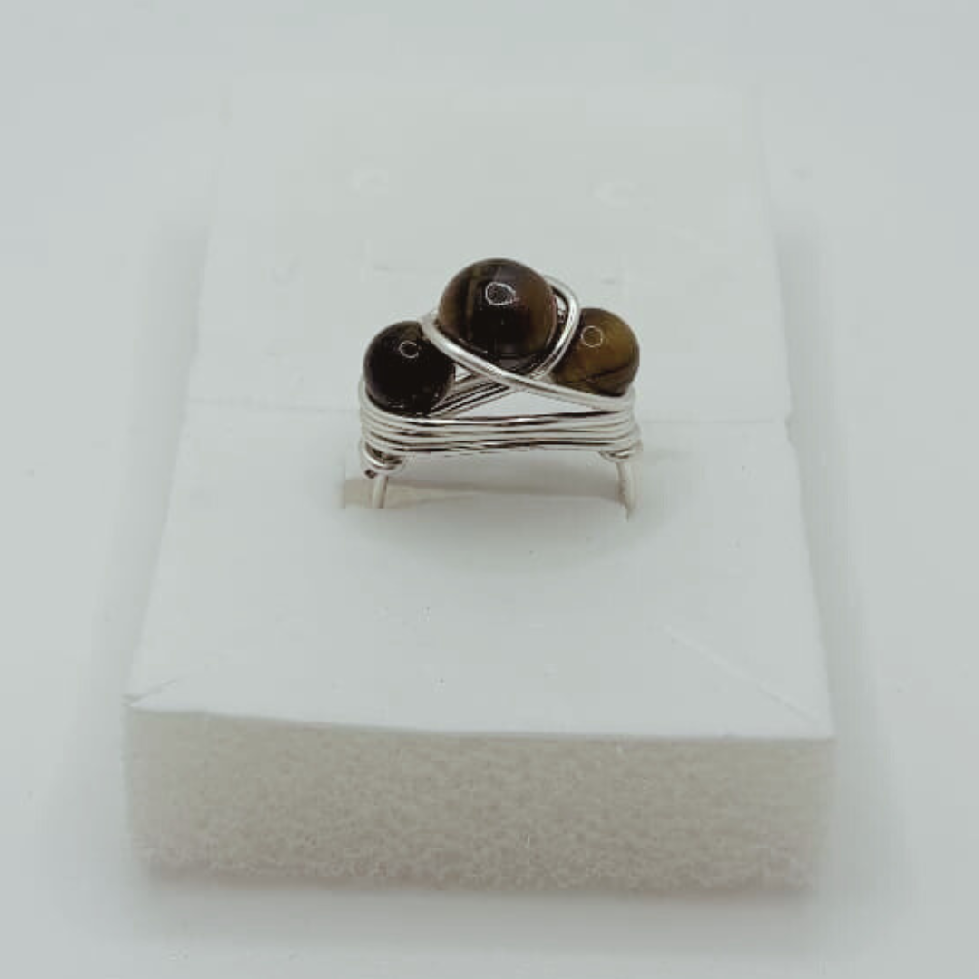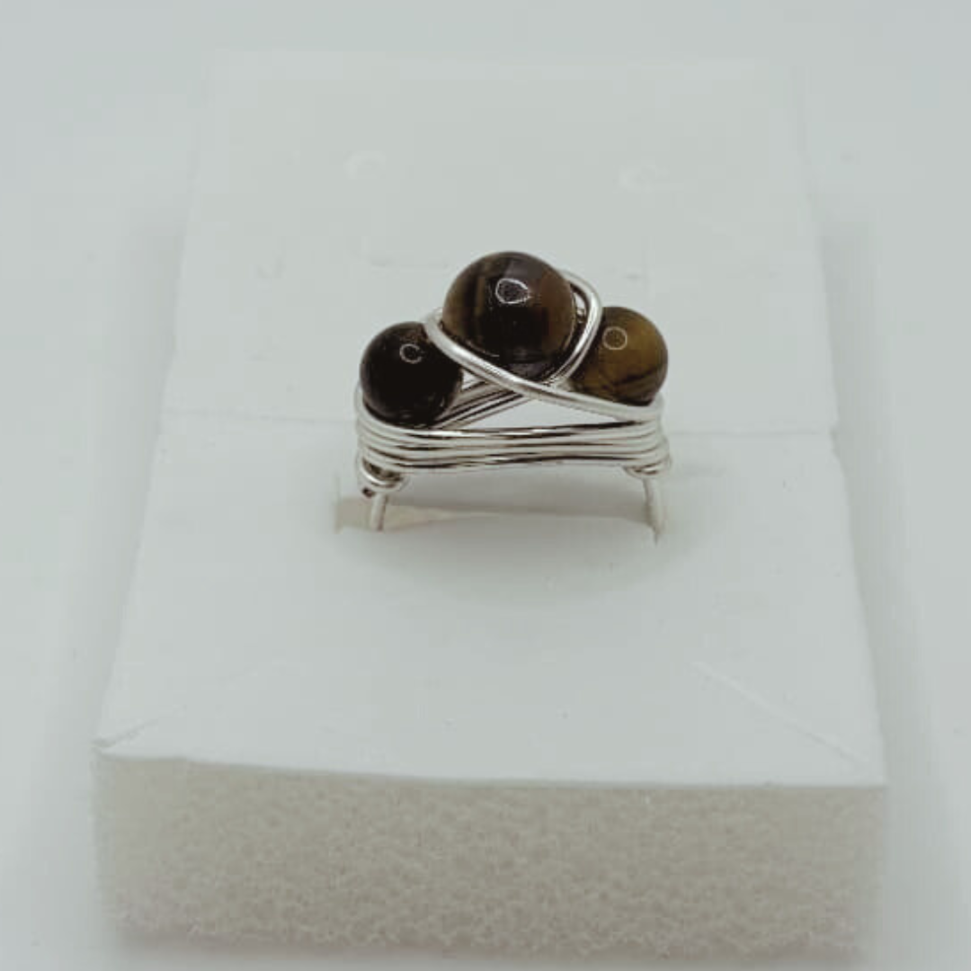 This stunning handmade ring features tree natural Tiger Eye beads stones, beautifully set in durable stainless steel wire.  Know as the stone of courage, strength and protection Tiger Eye bring balance and confidence to its wearer.